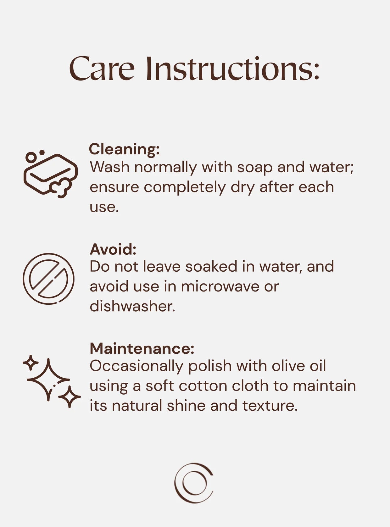 Avoid: Do not soak in water and do not use in the microwave or dishwasher.