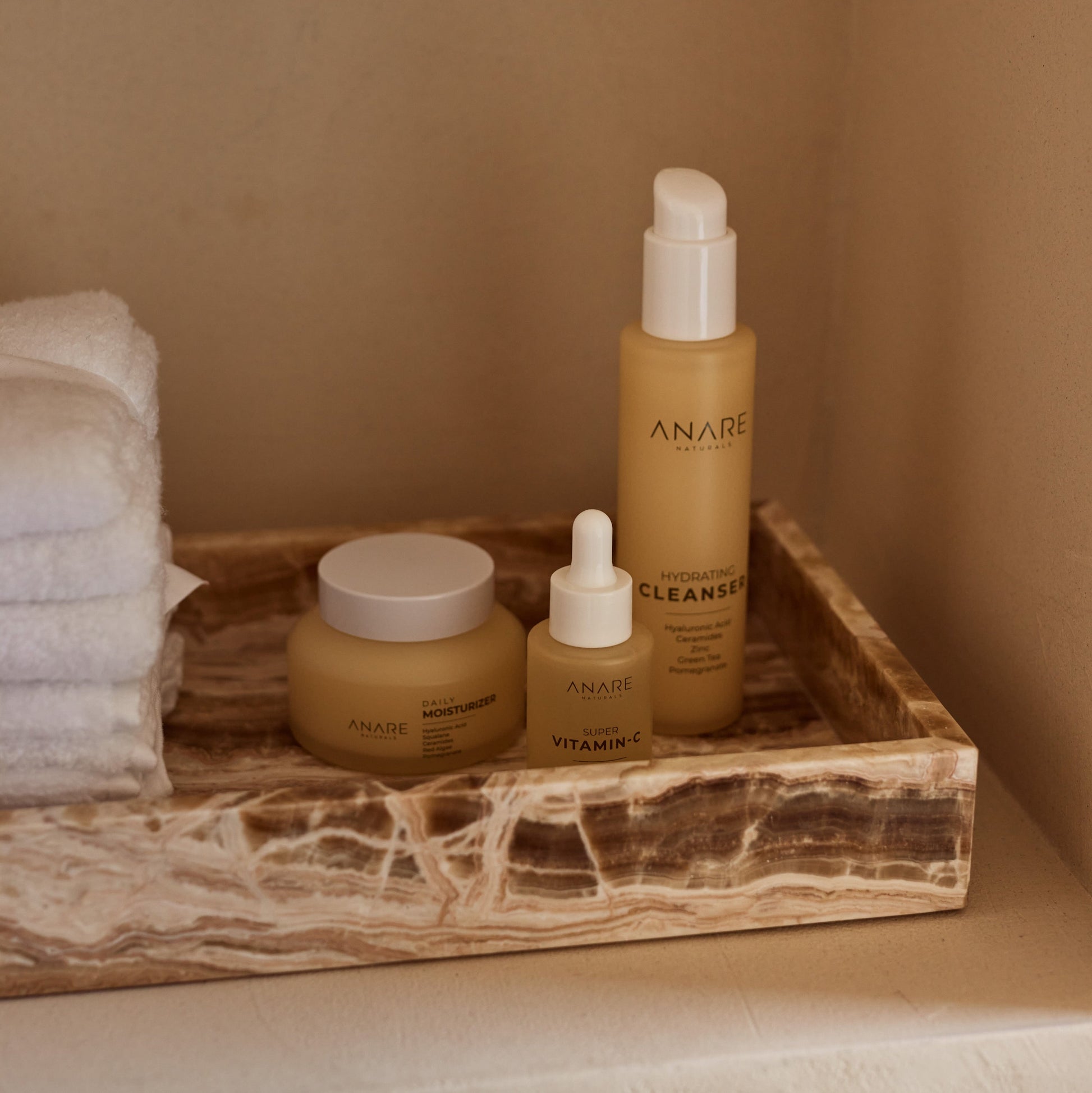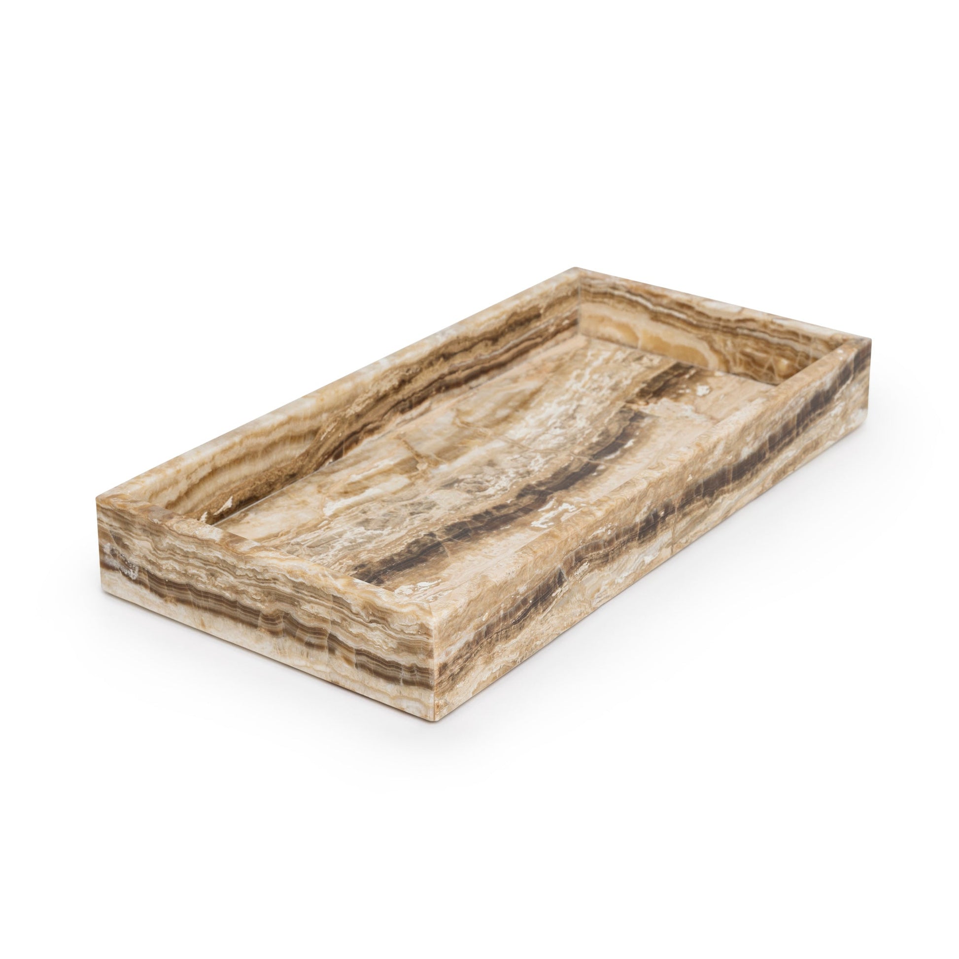 A large Sandal Onyx marble serving tray with raised edges. Cut from a single natural slab and polished smooth. The rim keeps items secure, making it ideal for candles, bottles, or a curated display. Every piece is unique.