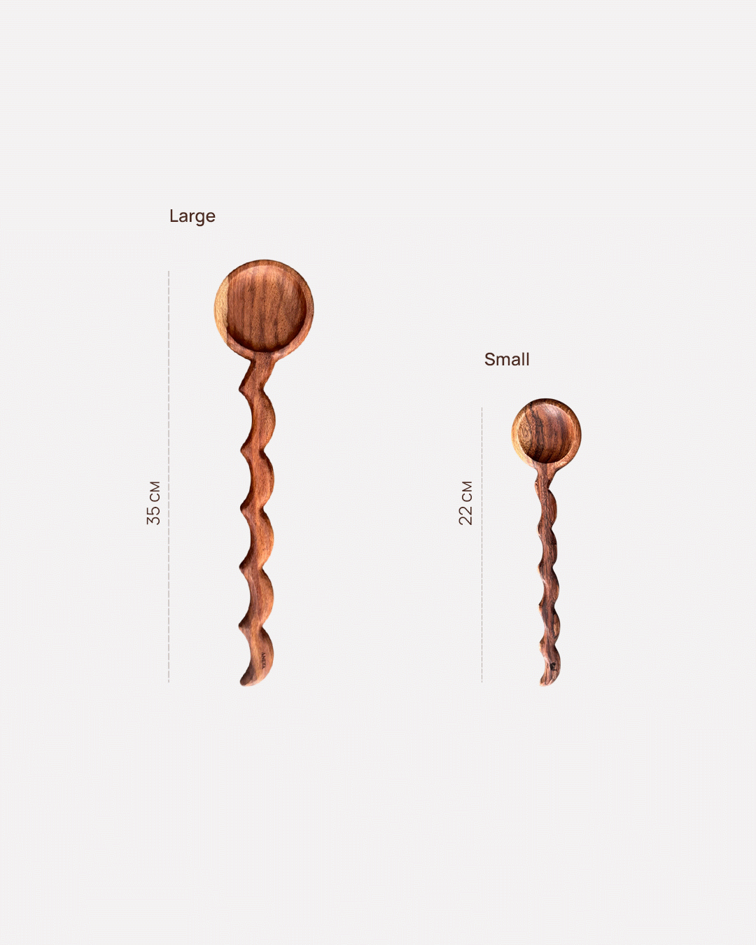 Handcrafted from natural Asersus wood—each spoon boasting unique color shades and wood grain patterns—these spoons are available in 22 cm and 35 cm sizes and are ideal for serving large dishes like curries, rice or salads, stirring deep pots, and adding a rustic touch to shared meals. They're also perfect baking companions for mixing batters or doughs, combining practicality with sculptural elegance.