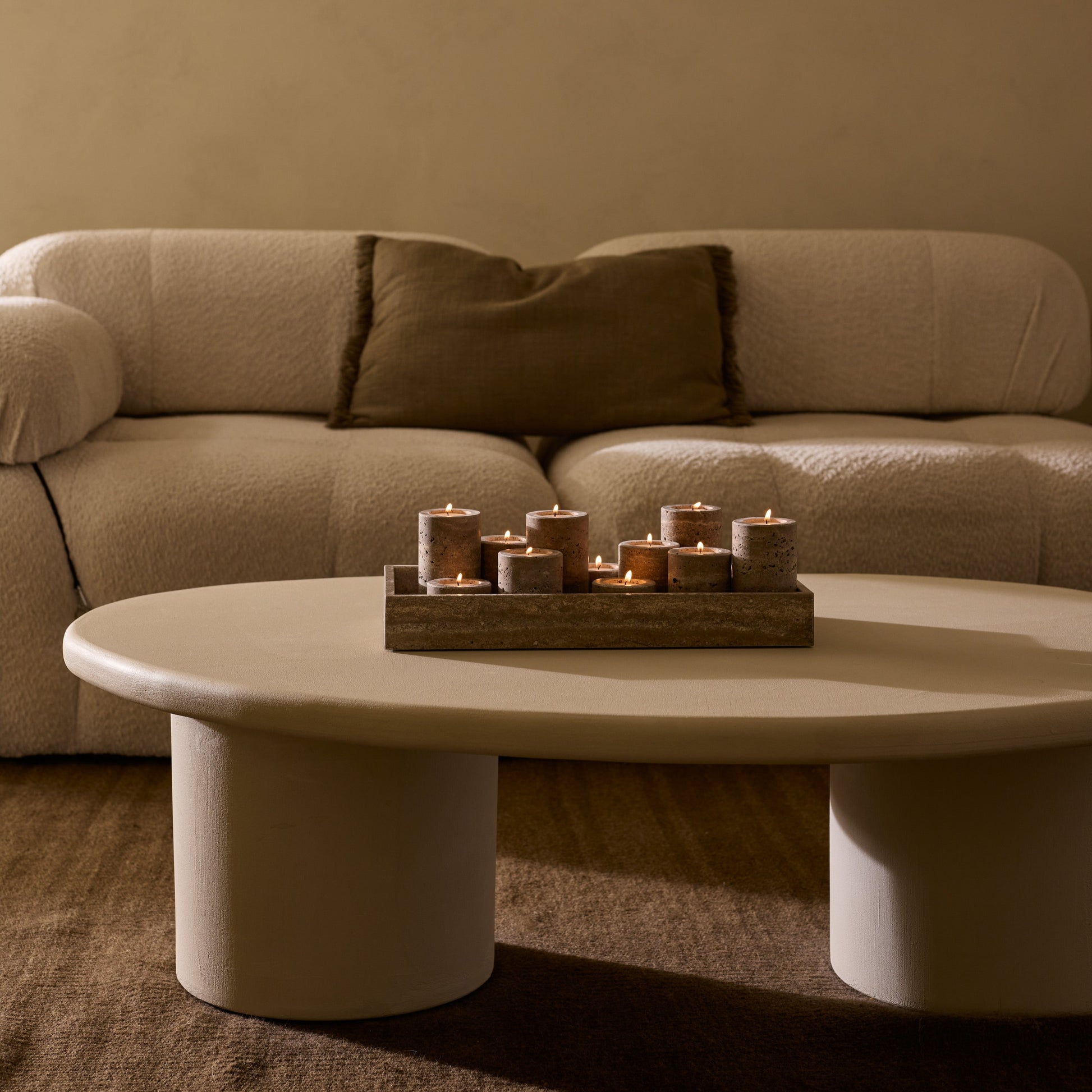 A titanium travertine tealight holder in the largest size. Hand-turned from a single piece of natural stone with distinctive grey veining. Creates an atmospheric glow when lit. Every piece is unique.