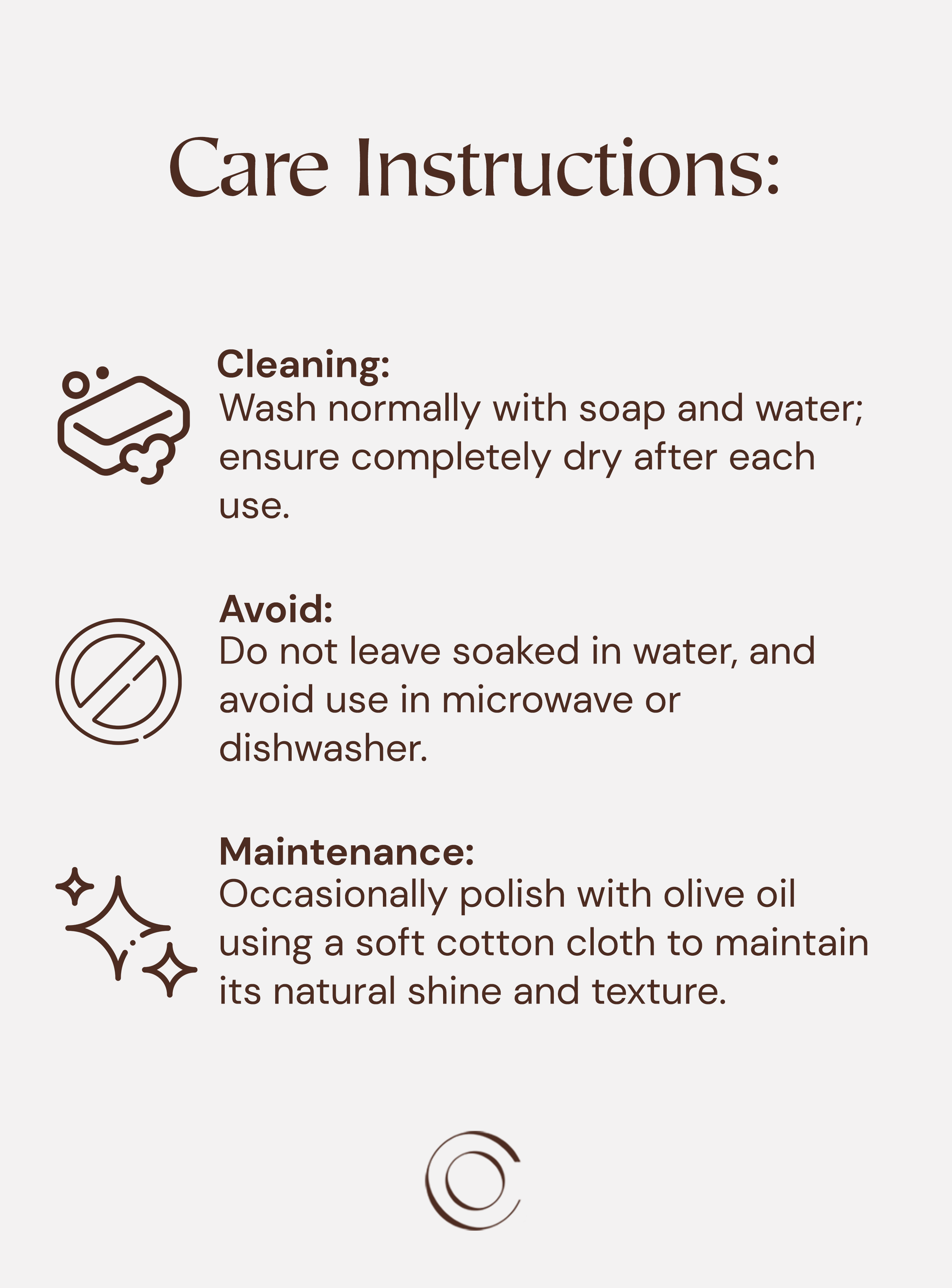 Maintenance: Occasionally polish with olive oil using a soft cotton cloth to maintain their natural shine and texture.