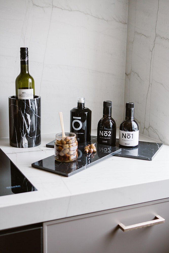 A Nero Marquina black marble bottle cooler that keeps your bottle chilled in style. Carved from a single natural block and polished smooth. The thick stone walls naturally maintain temperature. Also works as a stunning vase. Every piece is unique.