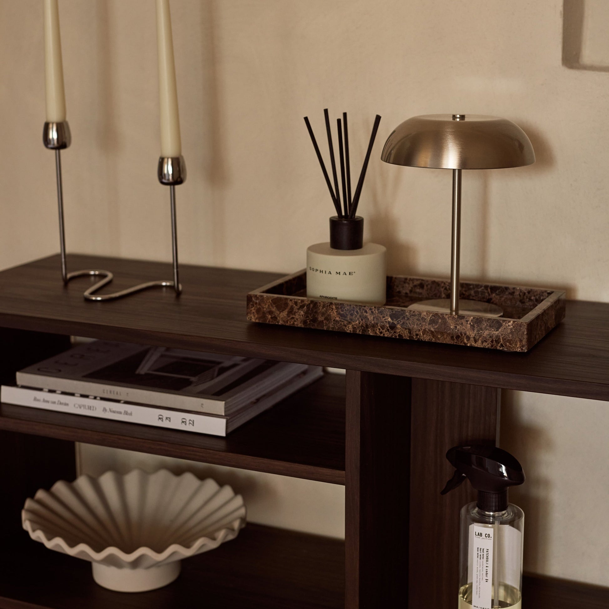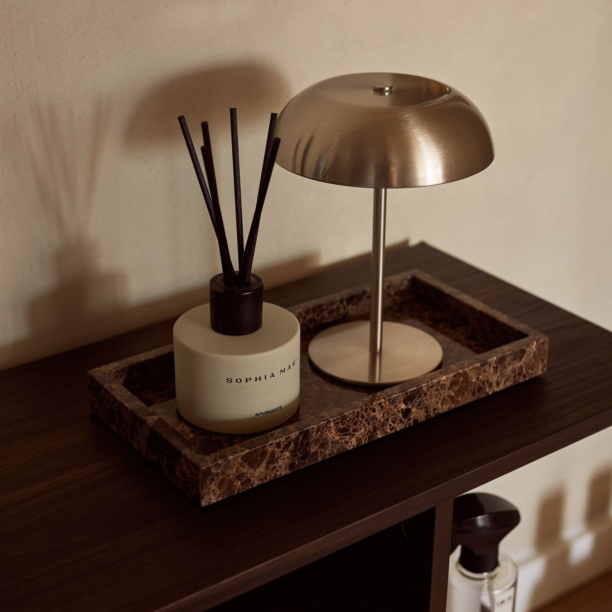 A flat Dark Emperador brown marble tray with clean lines. Cut from a single natural slab and polished smooth on all sides. Use it as a bathroom organizer, vanity tray, or display platform. Every piece is unique.