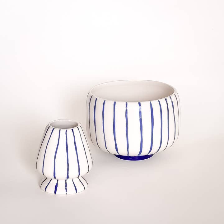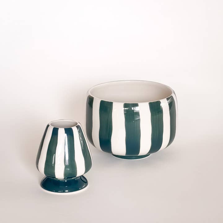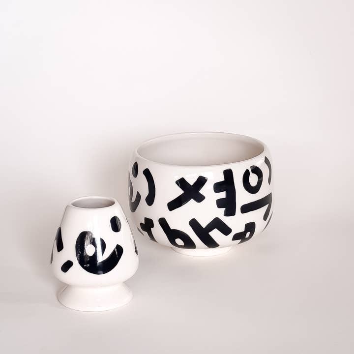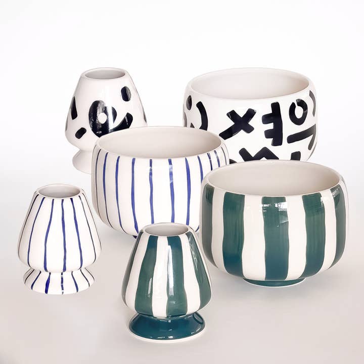Всеки сет съдържа ръчно изработена купичка за матча и съответстващ държач зра ботена за матча и съответстващ държач зарк. Двете части се съчетават хармонично, създавайки функционален и естетичен ансамбъл. Купичките са с традиционна форма и подходящи както за начинаещи, така и за опитна ча начинаещи. Всяко изделие е изрисувано на ръка, което го прави напълно уникално.