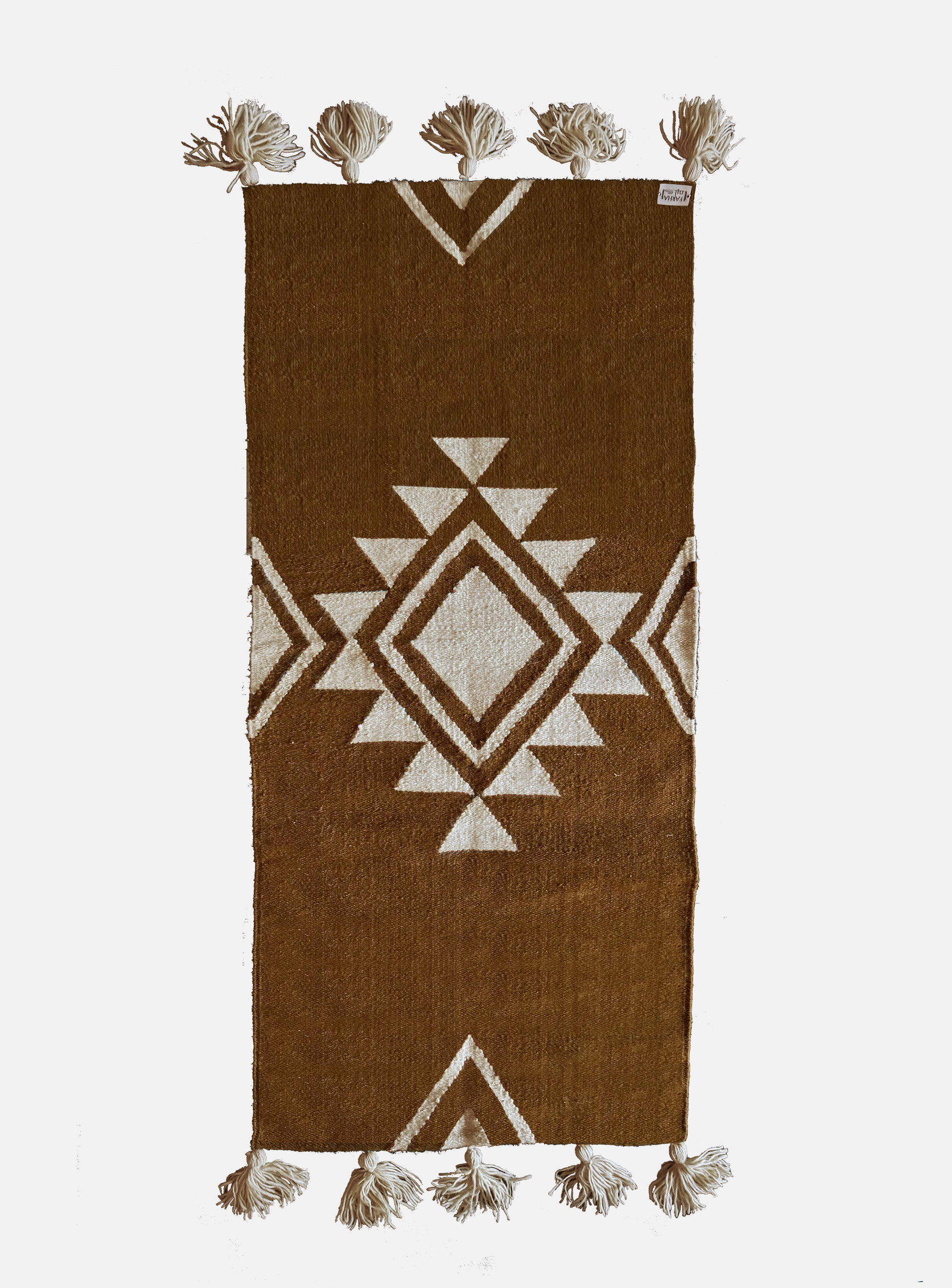 Atribute unice: Prezintă un model geometric îndrăzneț de tip raze de soare, cu detalii de tip ciucuri; fiecare piesă este realizată manual și este unică.