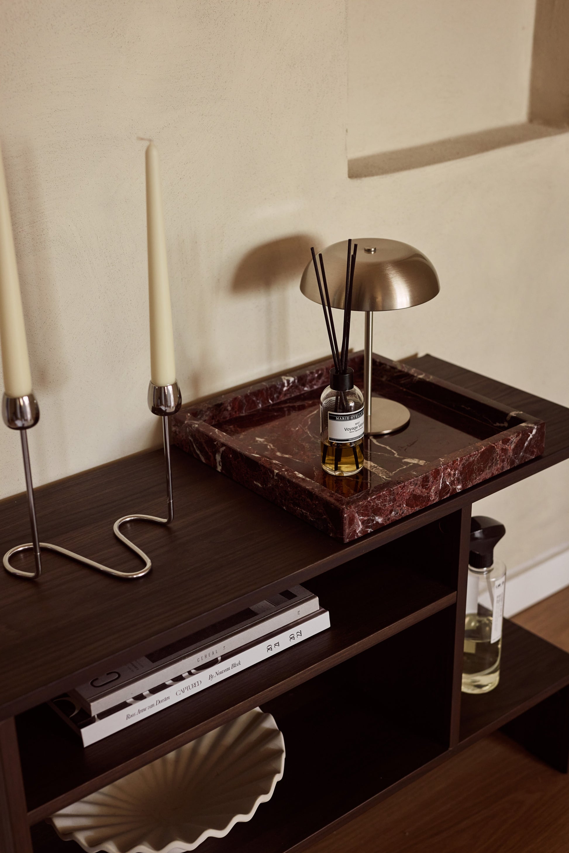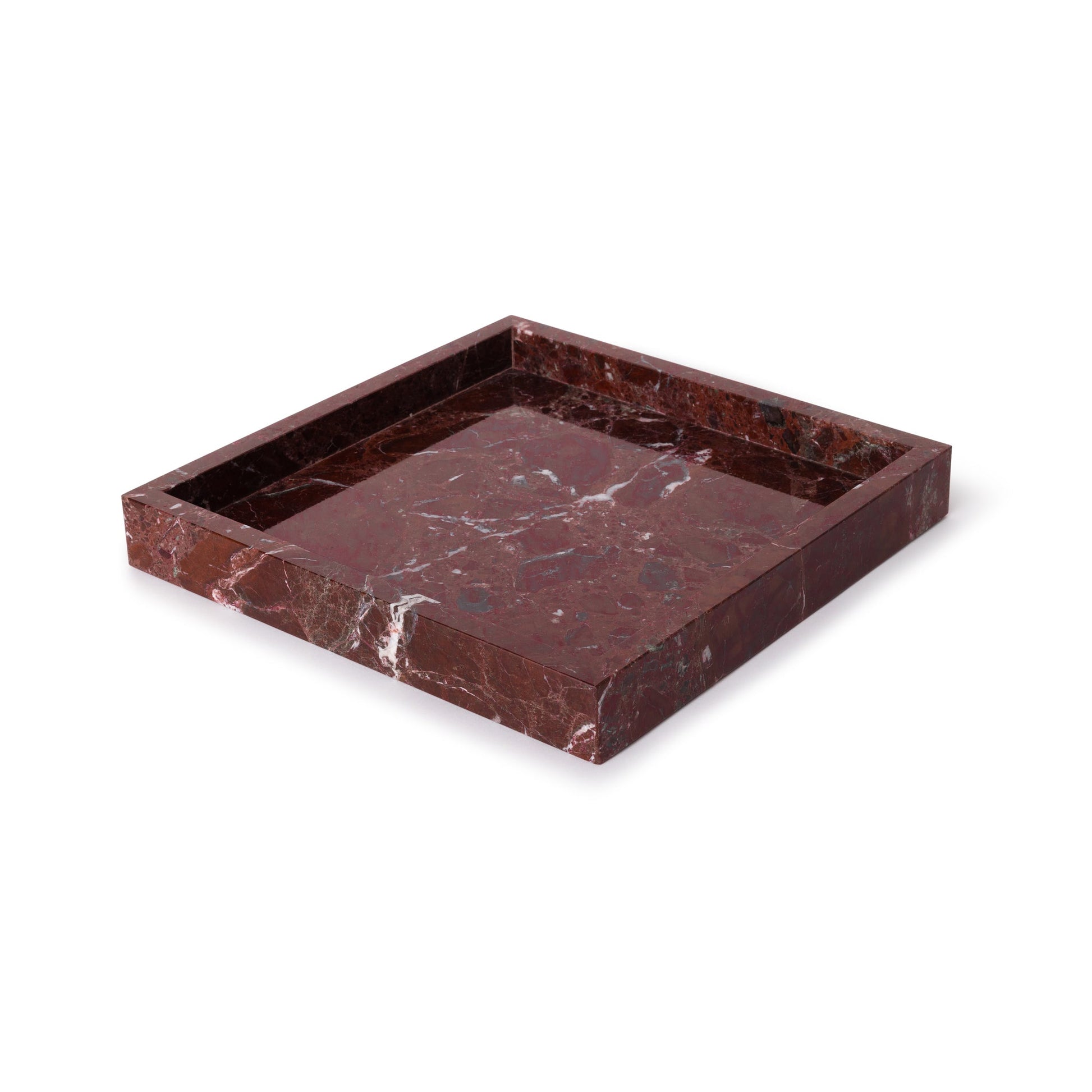 A square Rojo Alicante red marble tray that commands attention. Cut from a single natural slab with raised edges to keep everything in place. Ideal for a coffee table, ottoman, or dining centerpiece. Every piece is unique.