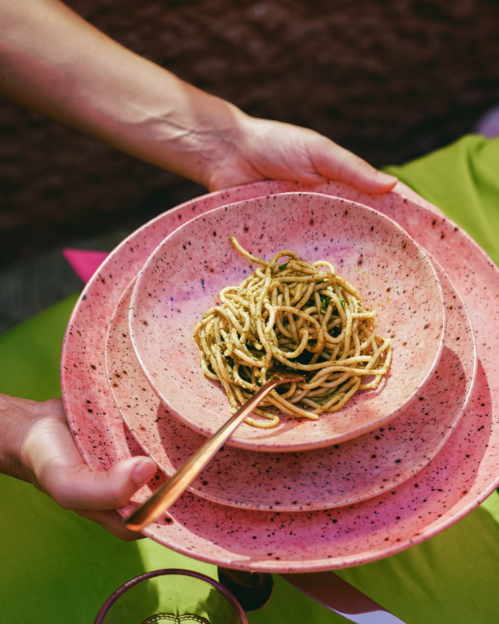 A handcrafted stoneware deep plate from the Rosalía collection, perfect for soups, salads or pasta. The soft blush glaze with natural speckles creates an organic, artisanal look. Each piece is thrown and glazed by hand in Spain, making every plate uniquely imperfect.