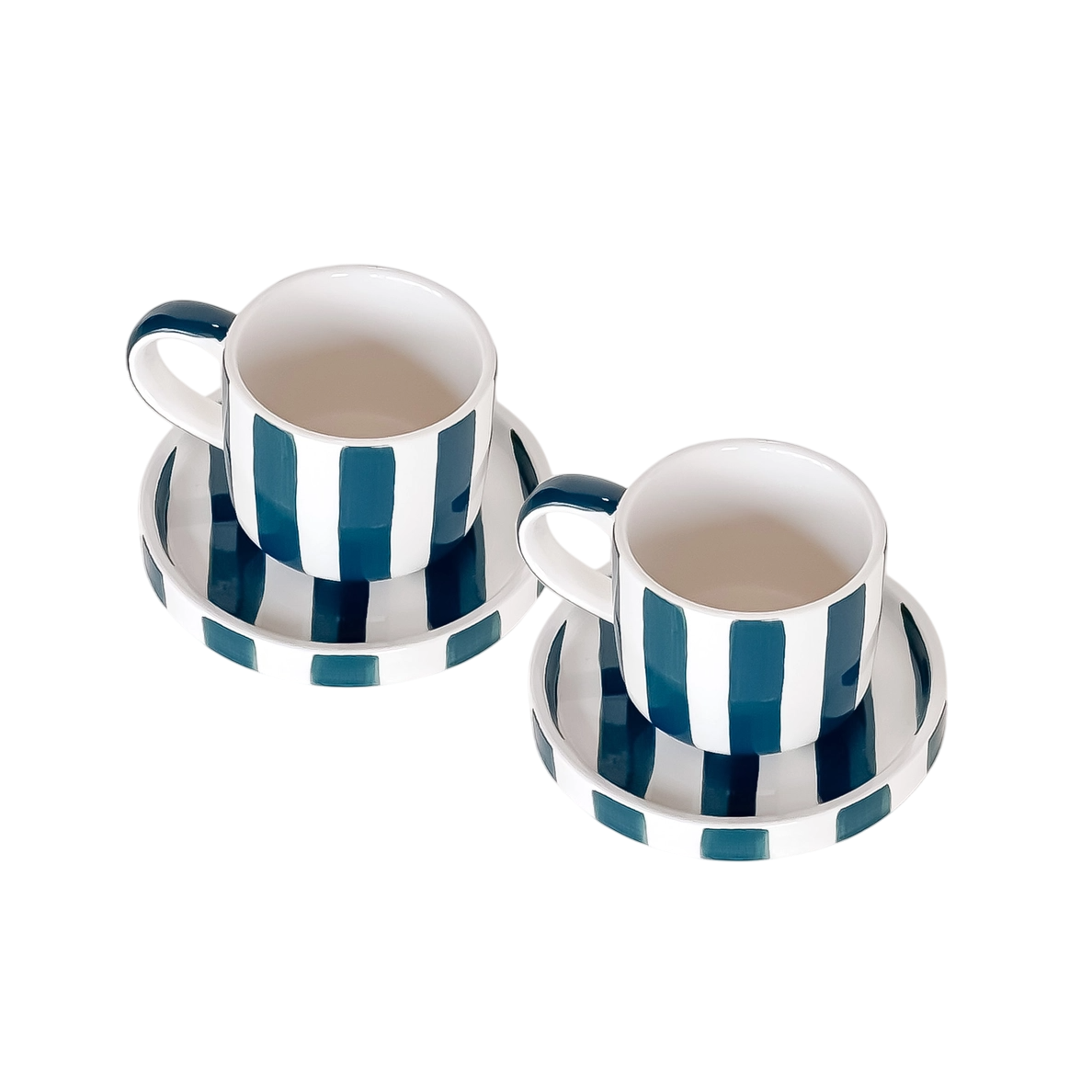 Еспресо комплектът е създаден за ценителите на италианското кафе и детайла. Комплектът включва две чаши и две чинийки (общо 4 части), изработени от високококача ствесрача ръчно нанесени ивици и глазура. Всяко изделие е уникално, с характерен ръчно рисуван завършек. Чашите са мини версия на нашите класически кафе чаши, а чинийките са с гладка повестрхнозтрхно вдлъбнатина – подходящи и за сервиране на малка закуска или десерт. Всеки комплект е опакован в устойчива екологична кутия – изискан избор за подарък илен старък илен стулогична кутия.