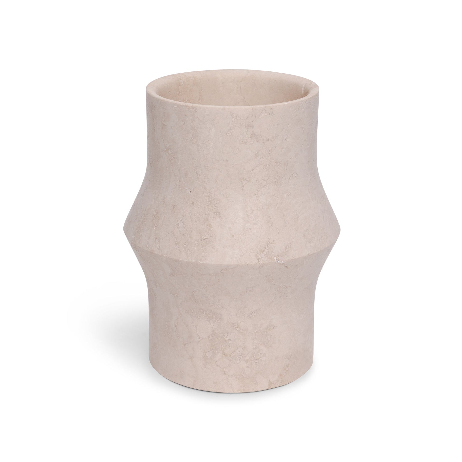 A modern travertine design vase with clean lines and a timeless silhouette. Hand-carved from a single block. Perfect for dried flowers, branches, or as a sculptural object. Every piece is unique.
